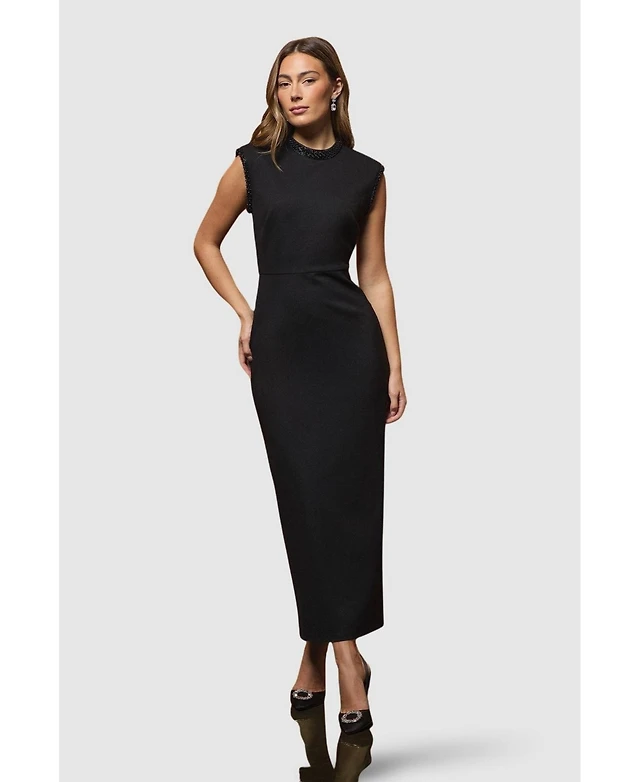 Lara Women's Beaded V-Neckline Dress with Cap Sleeves