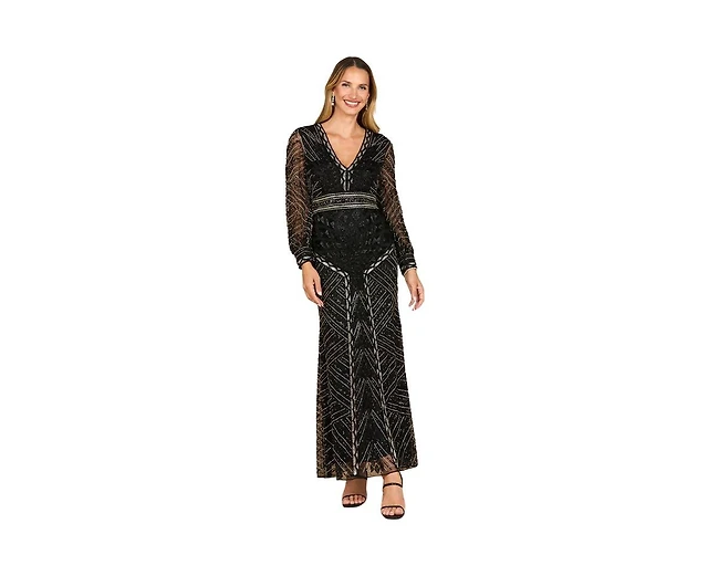 Xscape Caviar Beaded Mesh Panel Long Sleeve Contrast Matte Jersey Square Neck Sheath Gown