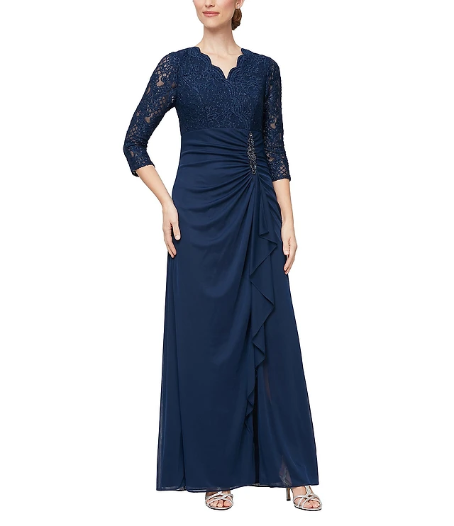 Pisarro Nights Beaded Illusion Boat Neck 3/4 Sleeve A-Line Dress