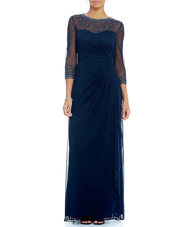 Alex Evenings Long Beaded Illusion Sweetheart Neck 3/4 Sleeve Ruched Dress