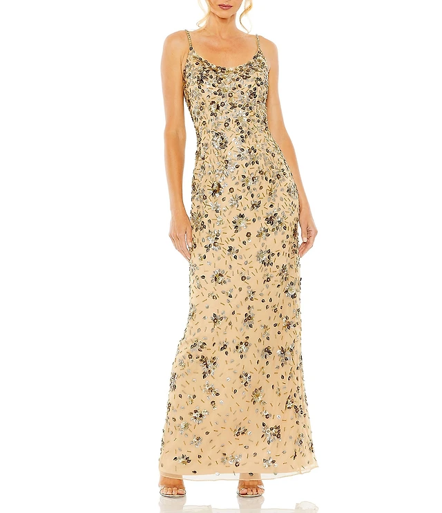Mac Duggal Jersey High Neck Long Sleeves 3D Beaded Floral Shoulder Column Gown