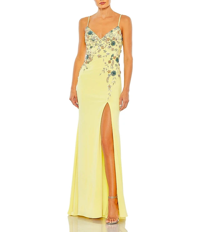 Mac Duggal Embellished Mesh Boat Neck Long Sleeve 3D Flower Caftan Gown