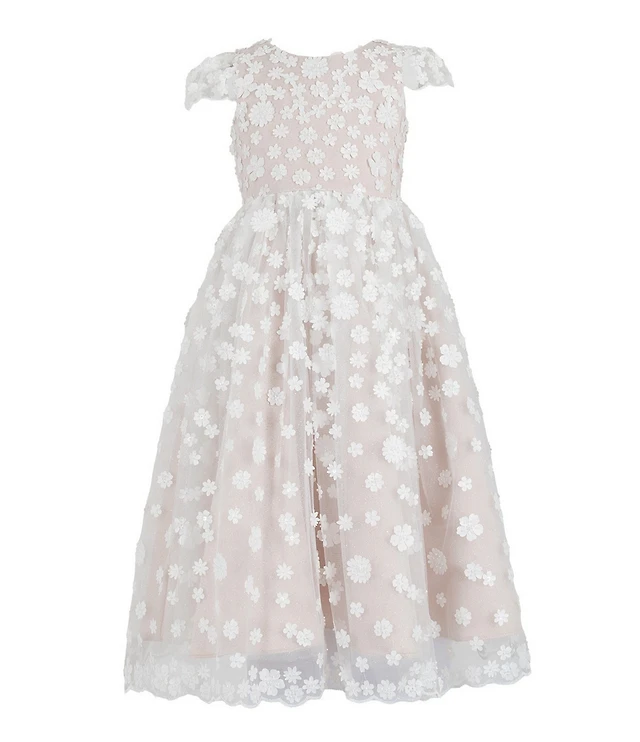 Chantilly Place Little Girls Floral 3D Beaded Mesh Cap Sleeve Bodice To Shirred Skirt Dress