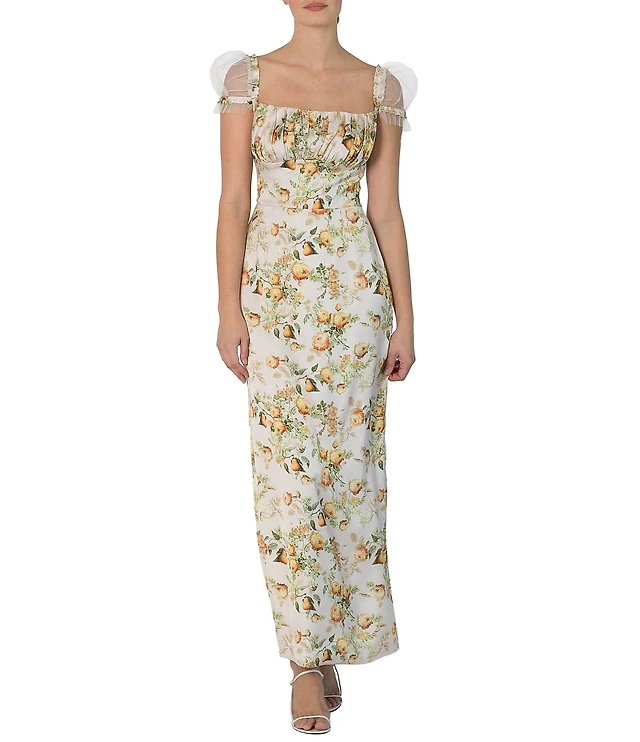 AFRM Plus Jolie Coordinating Floral Print Mock Neck Mesh Cap Sleeve Ruched Top