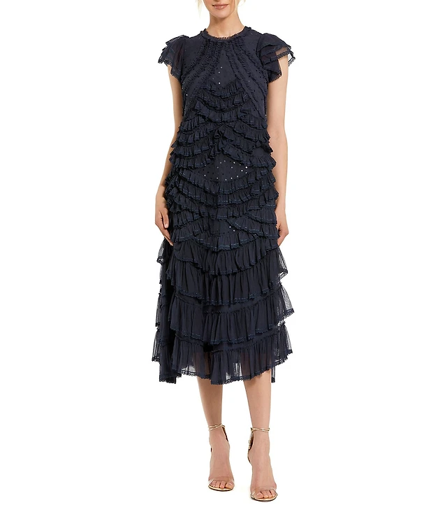 Betsy & Adam Women's Long Mesh Sequin Embroidered Cap Sleeve Dress