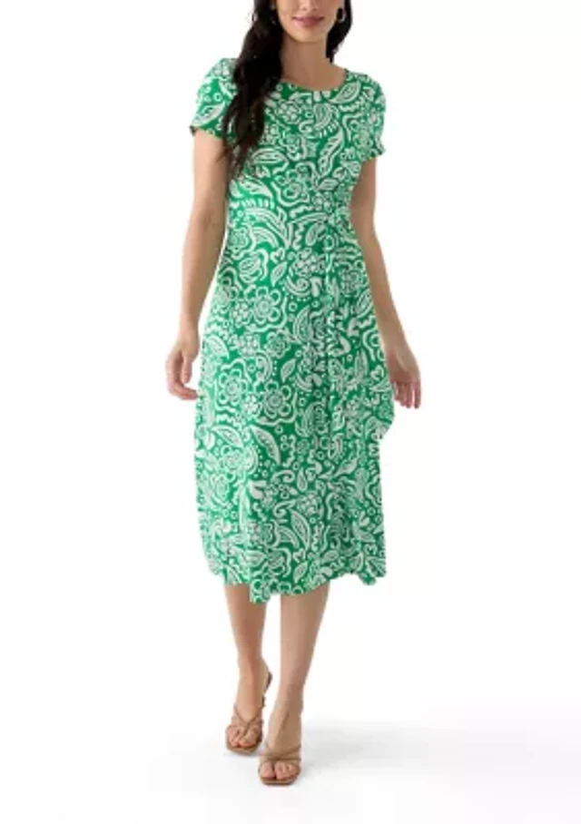 Womens Abstract V Neck Short Sleeve A Line Midi Dress