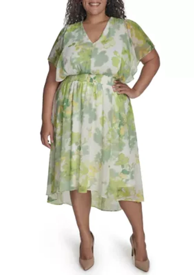 Plus Floral Printed Fit and Flare Chiffon Midi Dress