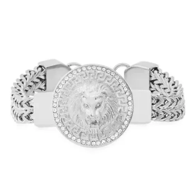 Men's stainless steel double row wheat chain and simulated diamonds lion head round charm bracelet with greek key accents