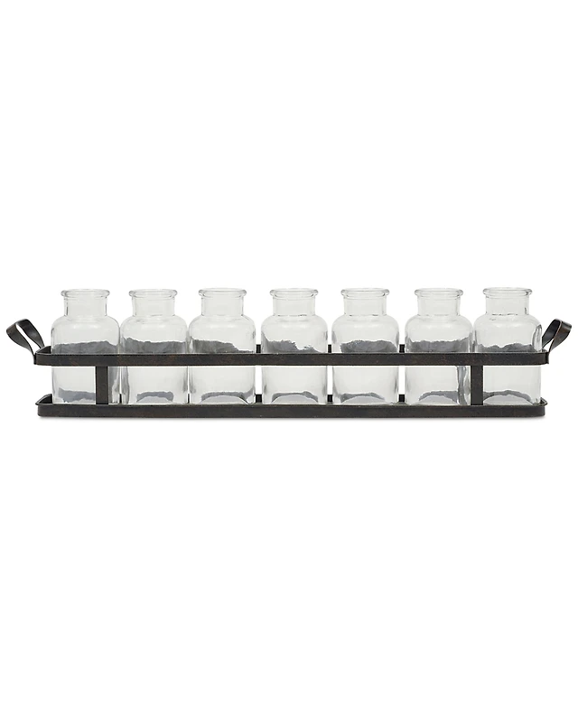 7 Glass Bottles on a Rectangle Metal Tray with Handles, Clear and Black, Set of 8