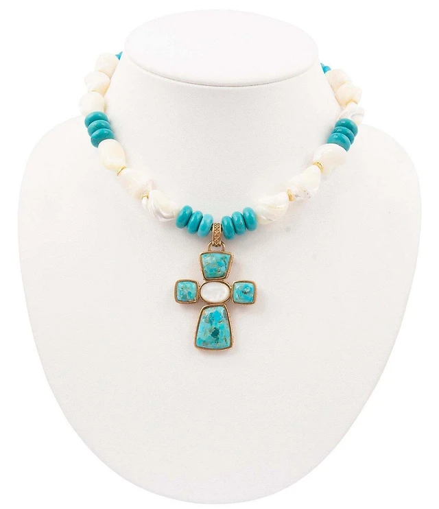 Southern Living x Barse Genuine Stone Meridian Cross Short Beaded Pendant Necklace