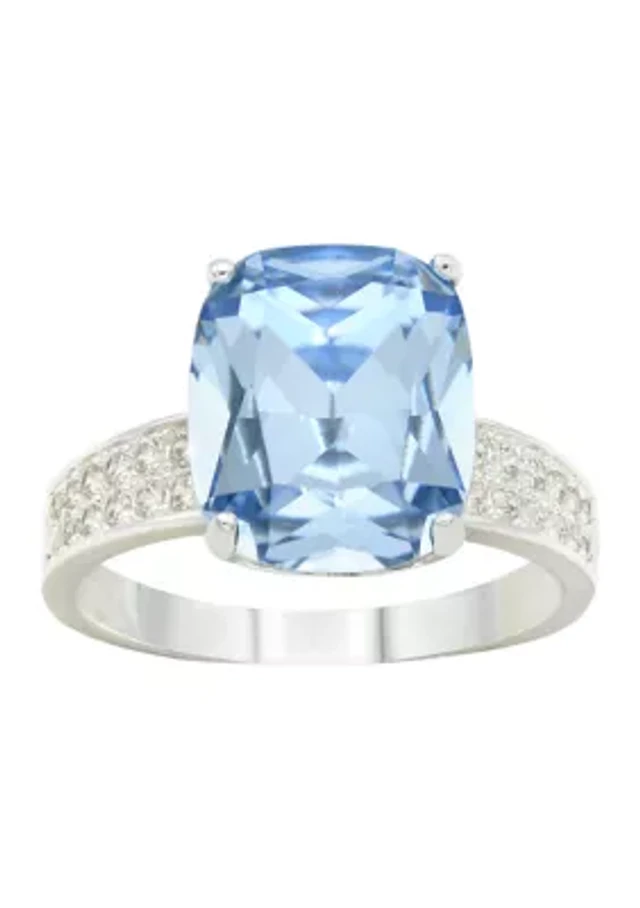 Lab Grown Silver Tone Cushion Cut Sapphire Crystal with Pavé Cubic Zirconia Band Ring