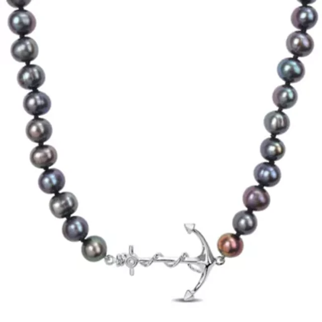 7-7.5mm Black Freshwater Cultured Pearl Anchor Charm Necklace in Sterling Silver