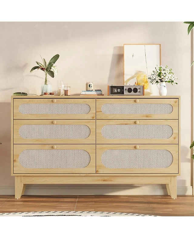 Gaomon Rattan 6-Drawer Bedroom Dresser, Oak Storage Chest with Deep Drawers, Modern Organizer for Bedroom Living Room Entryway Hallway