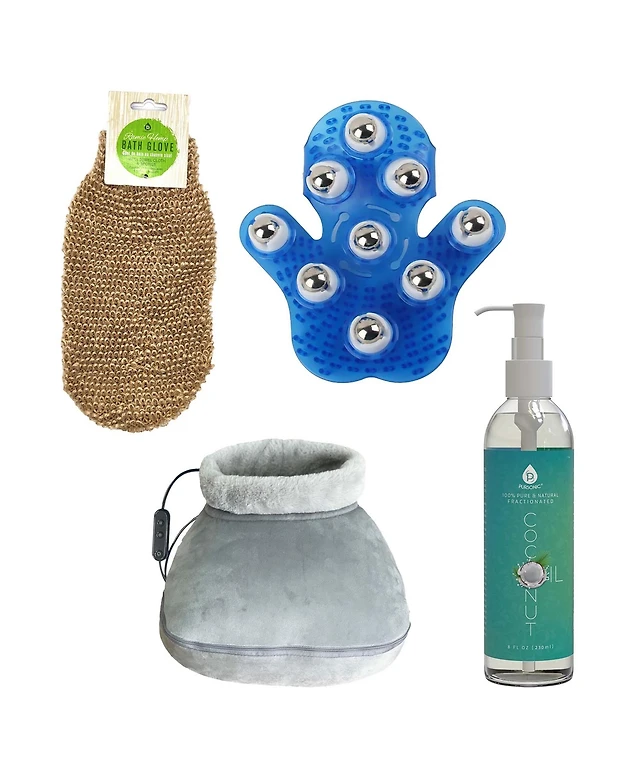 Weekend Wellness Bundle: Palm Massage Glove, Heated Foot Massager, Coconut Oil & Exfoliating Bath Glove