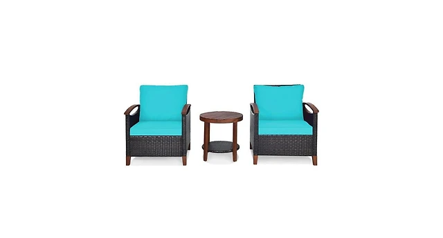 Gymax 3PCS Rattan Furniture Set Acacia Wood Coffee Table & 2 Chairs Backyard Patio