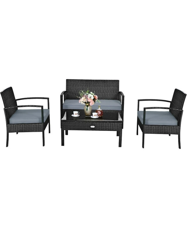 Gymax Set of 4 Rattan Furniture Set Cushioned Sofa Chair Coffee Table Patio