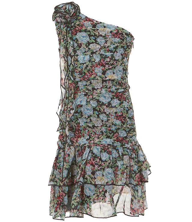 Amri Women's One Shoulder Dress With Cascading Ruffle Flower Detail