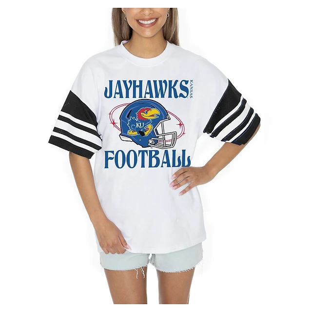 Women's Gameday Couture White Kansas Jayhawks Starting Lineup Contrast Sporty Heritage Oversized T-Shirt