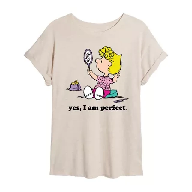 Sally Yes I'M Perfect Womens Juniors Crew Neck Short Sleeve Oversized Peanuts Graphic T-Shirt