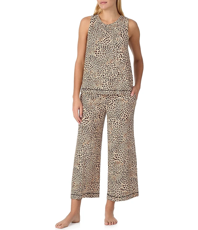 JOHNNY WAS Long Sleeve Notch Collar Knit Leopard Print Long Pajama Set