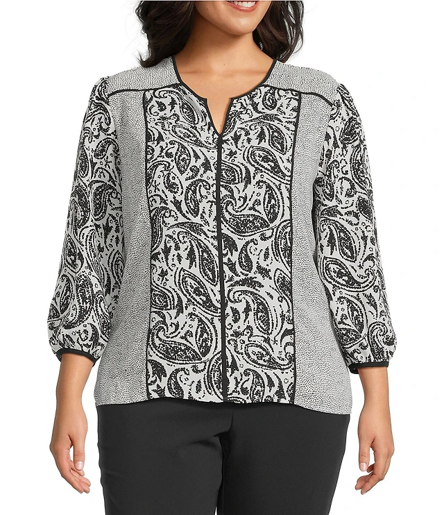 Investments Plus Size Dotted Paisley Mixed Print 3/4 Sleeve Split Round Neck Blouse