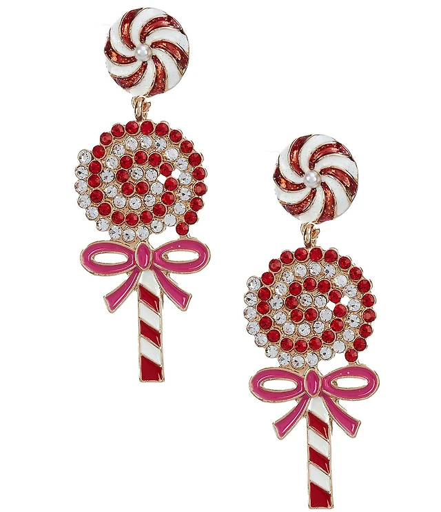 Merry & Bright Crystal Pave Bow Peppermint Candy Christmas Enamel Drop Earrings