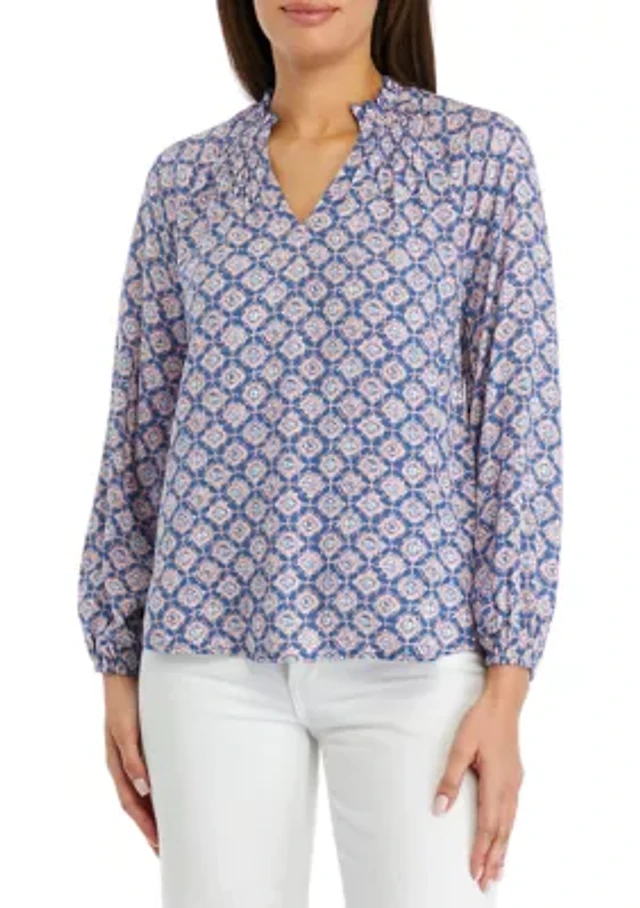 Ali Miles Petite Size Woven Multi Print Point Collar Long Sleeve Button-Front Tunic