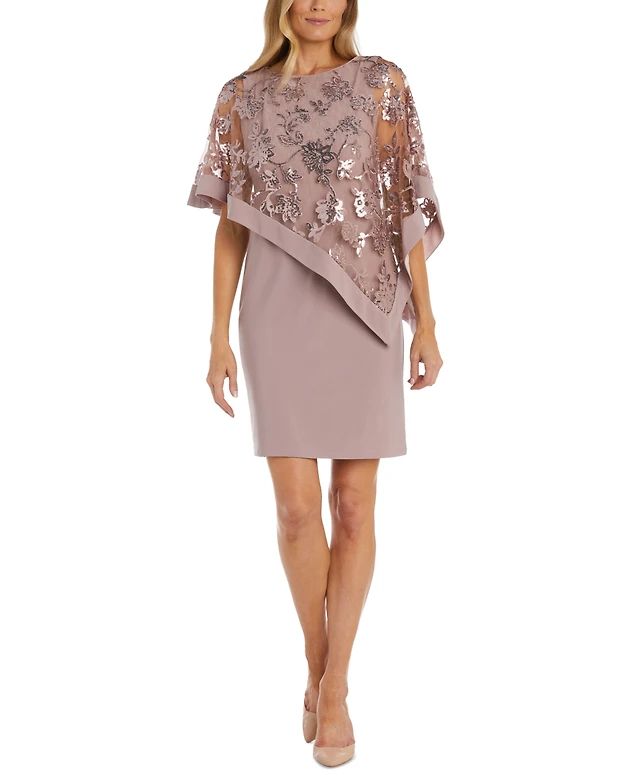 R & M Richards Plus Floral Sequin Power Mesh Beaded Sheer Capelet Sleeves Dress