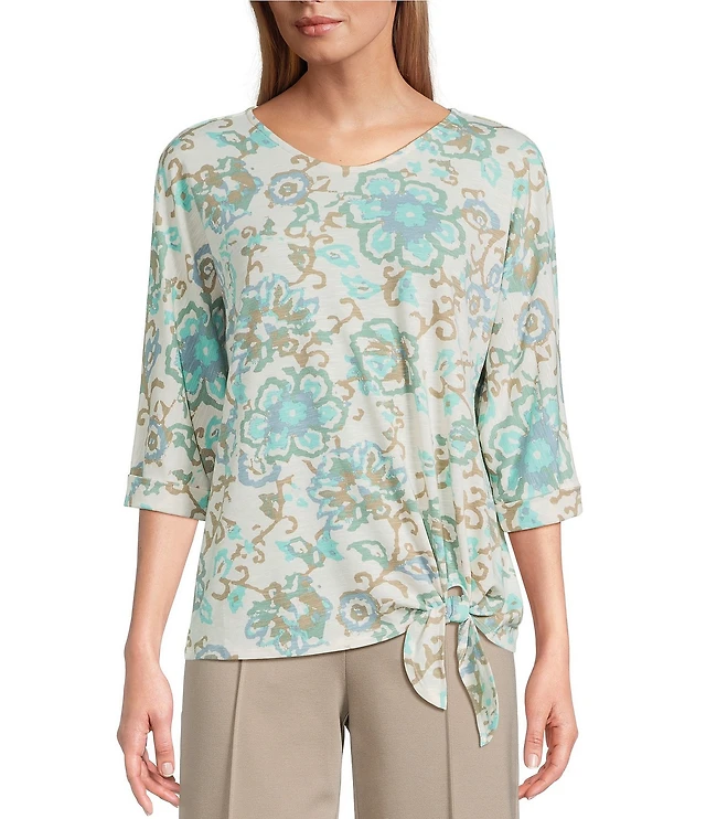 Ruby Rd. Petite Size Stamp Botanical Floral V-Neck 3/4 Sleeve Knit Top