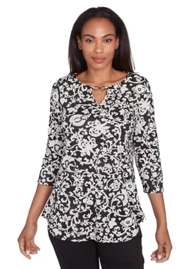 Petite Split Neck with Metal Clasp Detail Batik Scroll Dew Drop Printed Knit Top