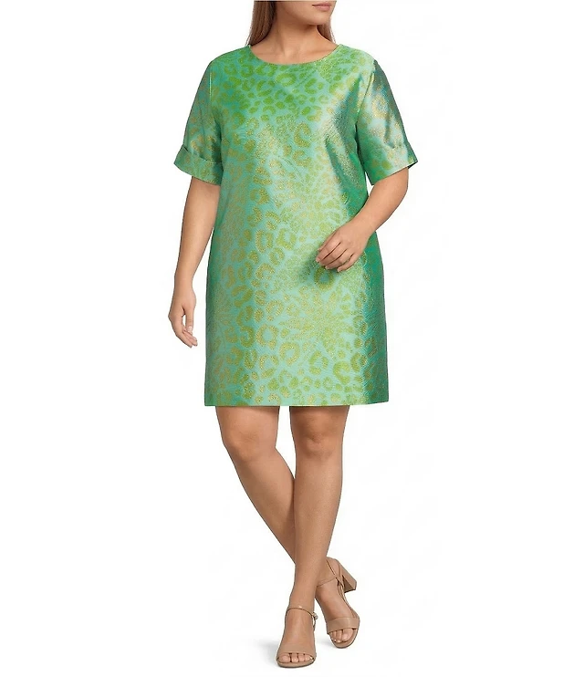 Caroline Rose Plus Leopard Print Matte Crepe Round Neck 3/4 Sleeve Shift Dress