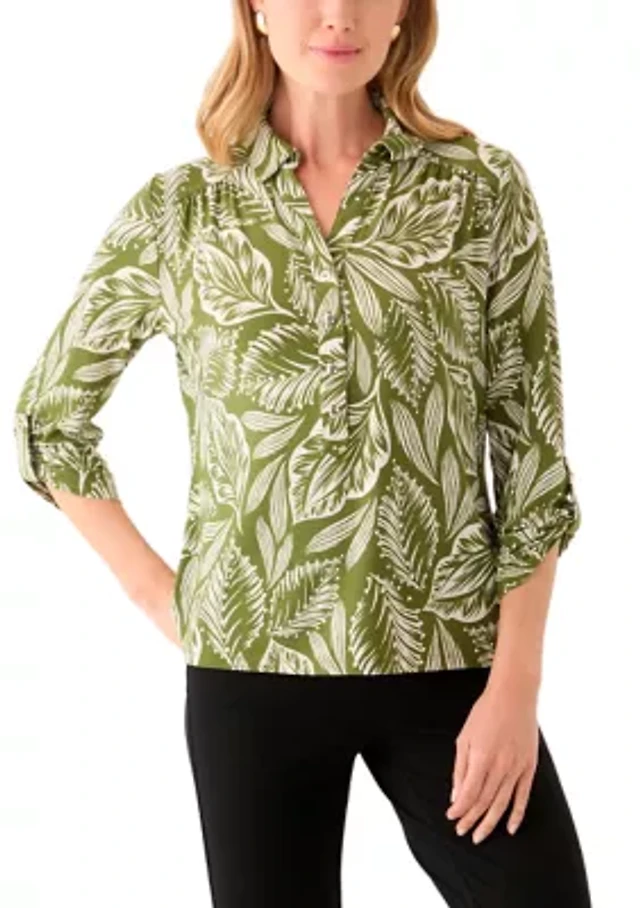 Petite 3/4 Roll Tab Sleeve Printed Collared Blouse