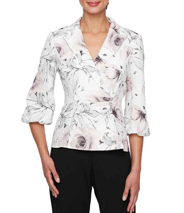 Alex Evenings Petite Size 3/4 Sleeve Boat Neck Asymmetrical Triple Tier Hem Floral Print Chiffon Blouse