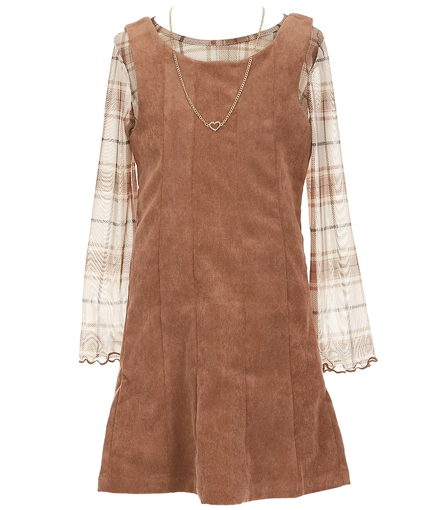 Rare Editions Big Girls Corduroy Jumper Dress And Plaid Mesh Long Sleeve T-Shirt Set