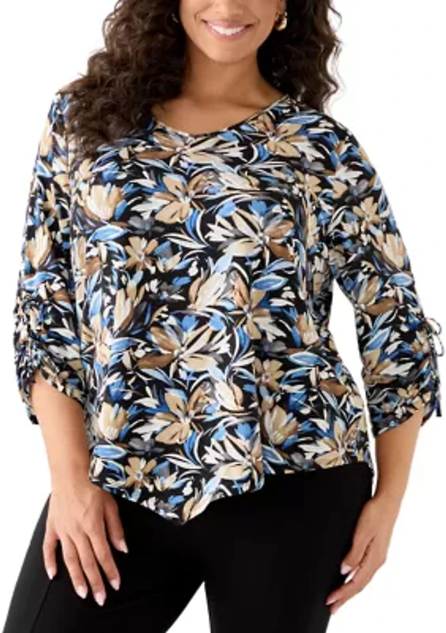 Allison Daley Plus Size Desert Flower Print 3/4 Tie Sleeve Point Collar Button Front Blouse