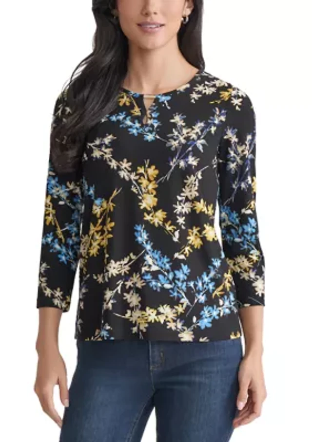 Petite Multi Print Extended Shoulder Pleat Neck Knit Top with Hardware