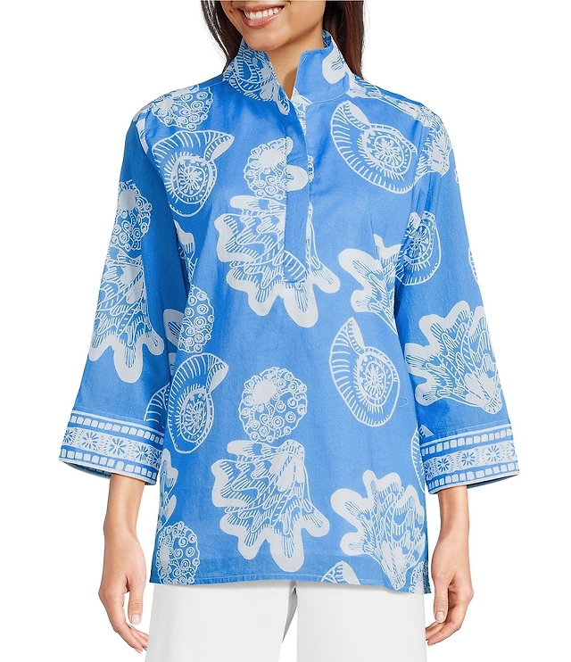 Ali Miles Printed Point Collar 3/4 Dolman Sleeve Button Front Tunic