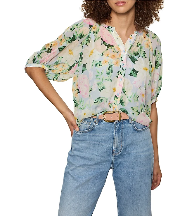 Ruby Rd. Plus Size Silky Gauze Hydrangea Paisley Split V-Neck 3/4 Sleeve Button Front Top