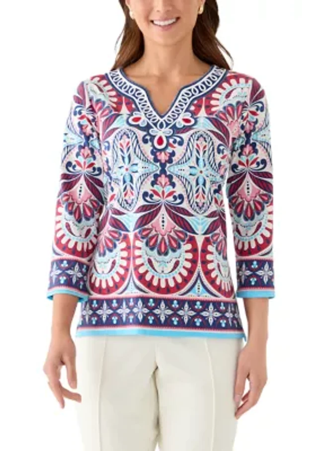 Ruby Rd. Petite Embellished Floral Sublimation 3/4 Sleeve Top