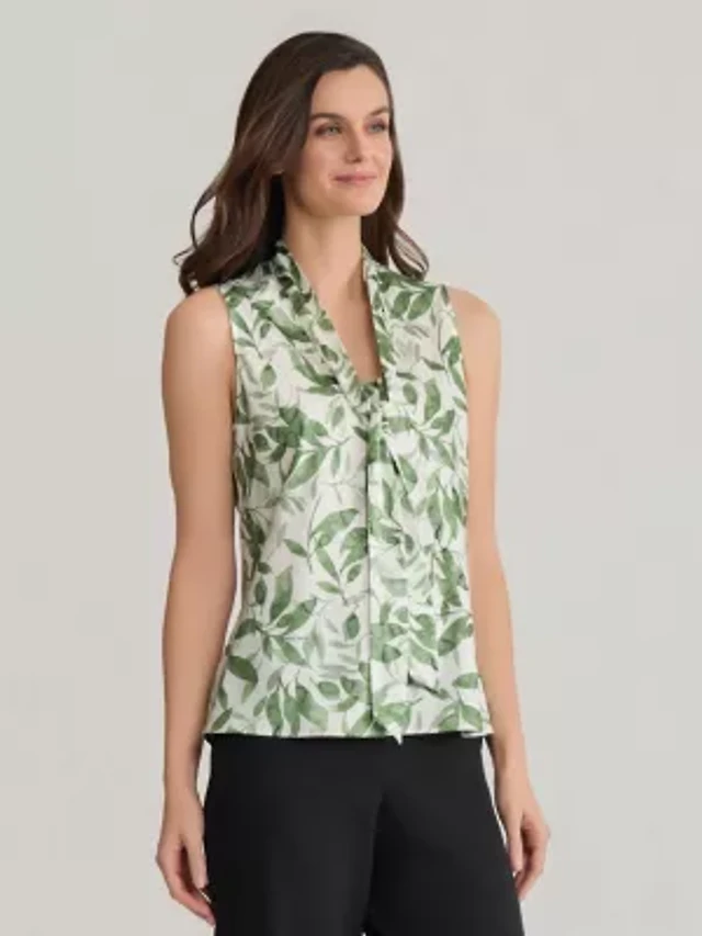 Kasper Plus Printed Sleeveless Tie-Neck Blouse