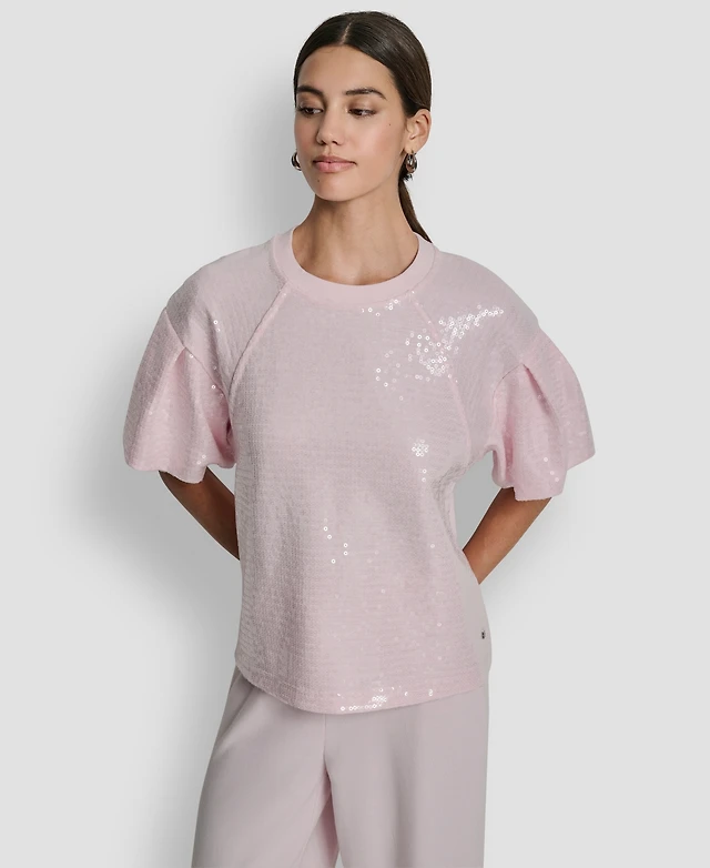 MELLODAY Sequin Crew Neck Short Puff Sleeve Top