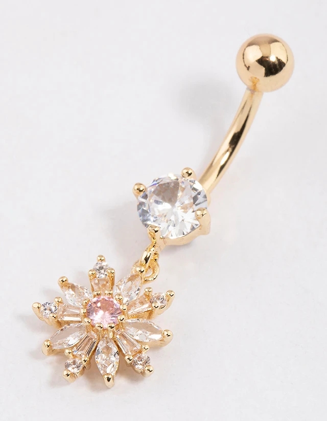 Gold Cubic Zirconia Flower Drop Belly Ring