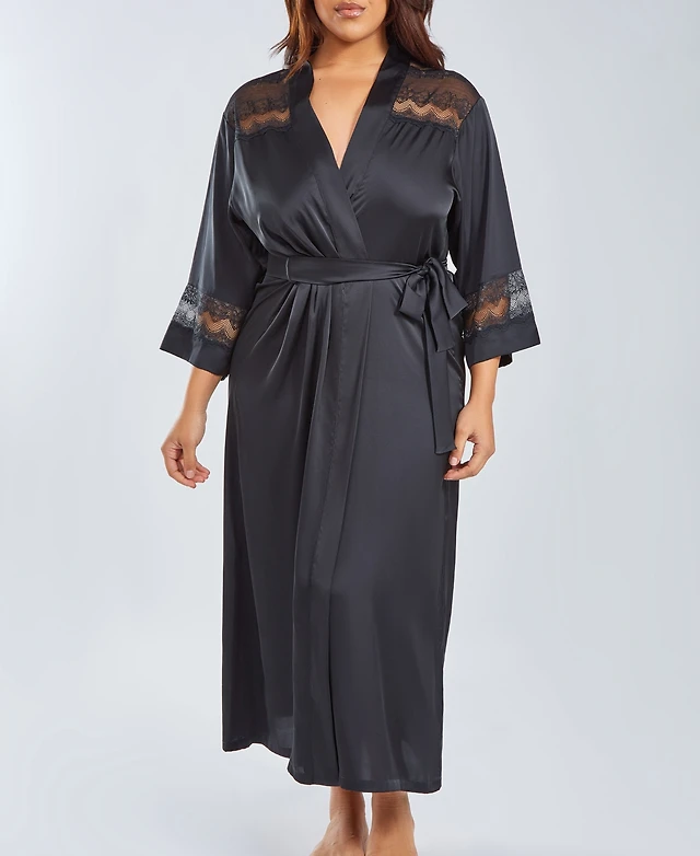 iCollection Kareen Plus Dotted Satin Robe with Lace Trimmed Sleeves and Self Tie Sash