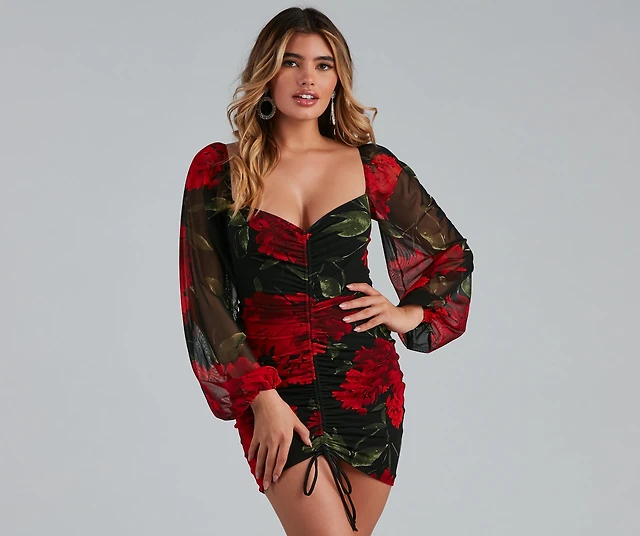 Damaris Bailey Rose Printed Square Neck Short Puff Sleeve Rose Midi Dress