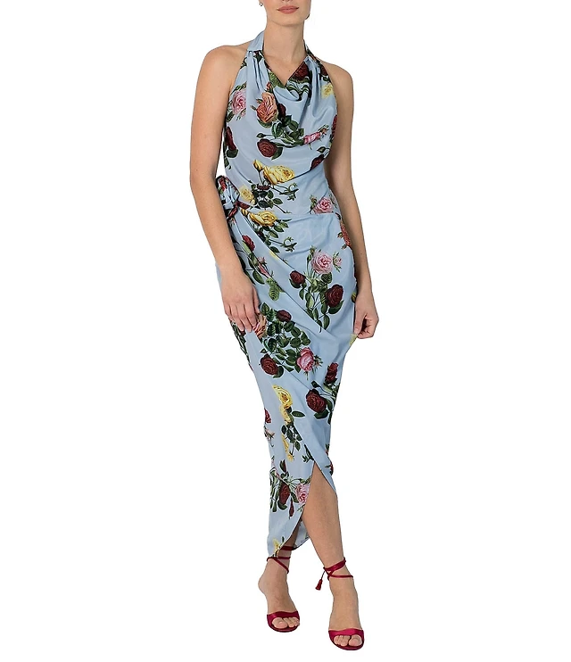 Caroline Rose Floral Print Crepe Scoop Neck 3/4 Sleeve Feather Trim Dress