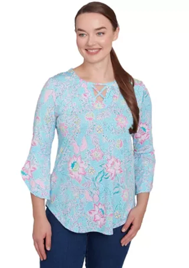Ruby Rd. Petite Size Knit Floral Border Print Keyhole Neck 3/4 Sleeve Top