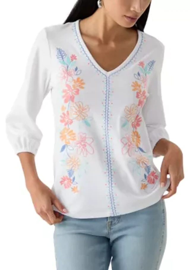 Ruby Rd. Embroidered Floral Twill Banded Collar 3/4 Sleeve Button Front Shirt