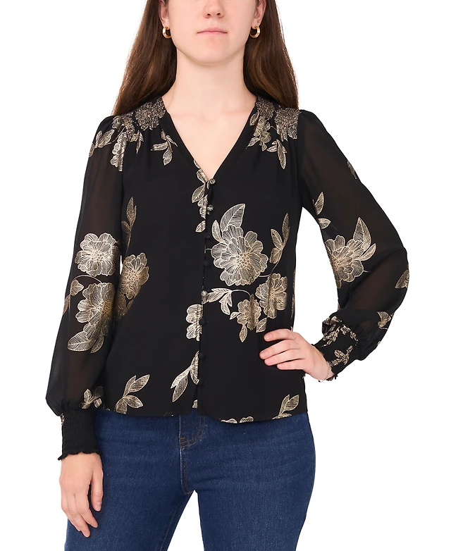 Ruby Rd. Silky Voile Floral Band V-Neck 3/4 Sleeve Button-Front Blouse