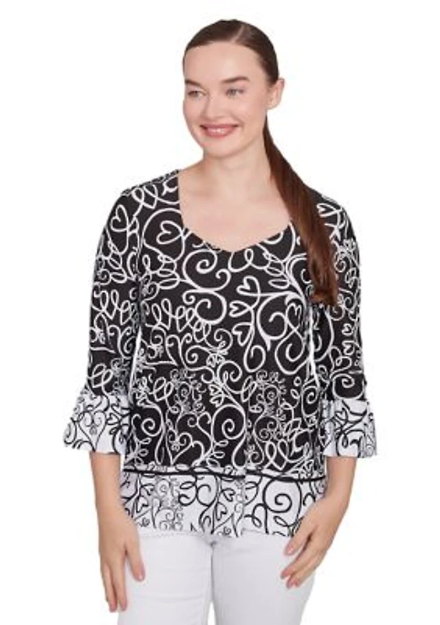Petite Keyhole Neck Floral Vine Placement Print Hacci Knit Shark Bite Top