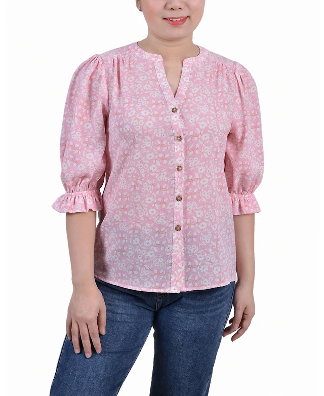 Petite 3/4 Sleeve Embroidered Yoke Top
